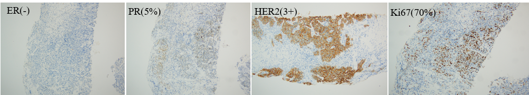 右乳肿块: Ki-67(+70%),P53(弥漫+),ER(-),PR(1+,5%),HER2(3+),EGFR(部分+),CK5/6(-),AR(+),E-cadherin(膜+),P120(膜+),CK5/6(-),P63(散+),Calponin(-),GATA(+)。符合浸润性导管癌。