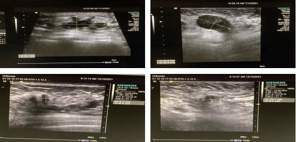 钼靶(2021-07-20,图2):右乳房下象限肿块影,形态不规则,边界不清,边缘可见分叶,病灶内多发点状、粗点状钙化灶,病灶大小约38*17mm。右腋前份显示增大淋巴结。