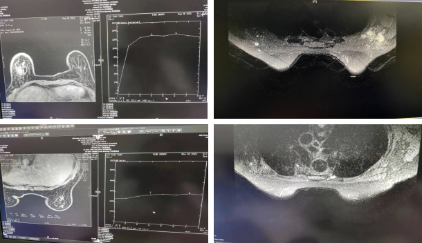 乳腺MR(2021-11-03):右乳ca治疗后,右乳腺体T2W1信号不均,DWI呈高信号,ADC值为2.01*10-3mm2/s。外下象限可见斑片影,边界不清,增强后强化不明显。双腋窝未示明显肿大淋巴结。胸骨右旁示DWI呈高信号小结节样影。