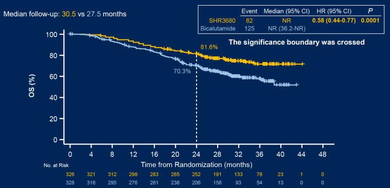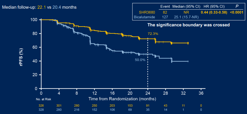 基线特征:从2018年6月28日起,共纳入654例患者,其中瑞维鲁胺组326例,比卡鲁胺组328例,两组的基线特征基本相当,均衡可比。中位年龄均为69.0周岁,两组的中国人群占比均为90%以上(90.5% vs 90.2%)。