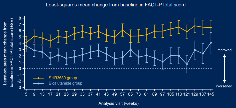 此外,在次要终点方面,截止2022年2月28日,相较于比卡鲁胺组,瑞维鲁胺组研究者评估的rPFS(HR 0.39,95% CI 0.30-0.50)、至PSA进展时间(HR 0.21,95% CI 0.16-0.27)、至下次骨相关事件时间(HR 0.65,95% CI 0.50-0.84)、至下次抗前列腺癌治疗开始时间(HR 0.33,95% CI 0.26-0.41)均获益明显。瑞维鲁胺组的客观缓解率为81.0%,高于比卡鲁胺组13.0%(95% CI 3.6-22.4)。探索性终点方面,瑞维鲁胺组的第12周末PSA90较比卡鲁胺组提高15.5%(94.4% vs 78.9%,95% Cl 7.8-23.2),PSA未检出率(PSA≤0.2 ng/mL)较比卡鲁胺组提高35.2%(68.7% vs 33.5%,95% Cl 28.0-42.4)。随访期间,瑞维鲁胺组FACT-P生存质量评分整体高于比卡鲁胺组(图3)