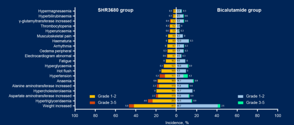 在安全性方面,瑞维鲁胺组无治疗相关不良事件(TRAE)导致的死亡发生,比卡鲁胺组则有1例。瑞维鲁胺组3级及以上的TRAE发生率为20.7%,比卡鲁胺组为14.5%。瑞维鲁胺组最常见的TRAE为体重增加和高甘油三酯血症,发生率分别为46.7%和27.9%(图4)。