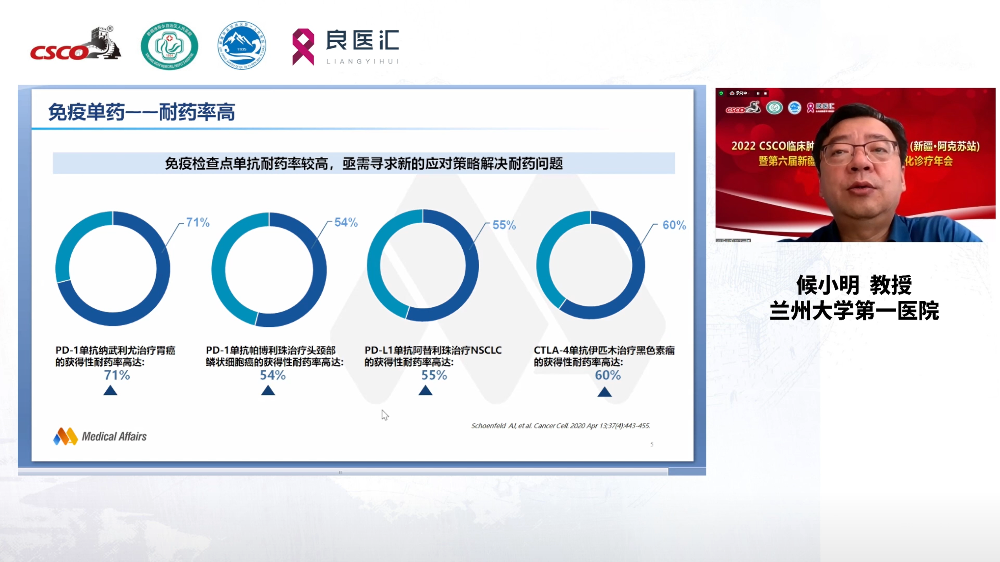 四川大学华西医院黄媚娟教授从分子分型、可手术NSCLC、不可手术Ⅲ期NSCLC、Ⅳ期NSCLC等多个方面解读了2022版《CSCO原发性非小细胞肺癌诊疗指南》更新要点,深入浅出地讲解了指南更新对临床的指导意义。喀什地区第一人民医院田序伟教授、兵团第一师医院艾合买江教授、新疆医科大学第八附属医院米热古丽教授参与讨论。