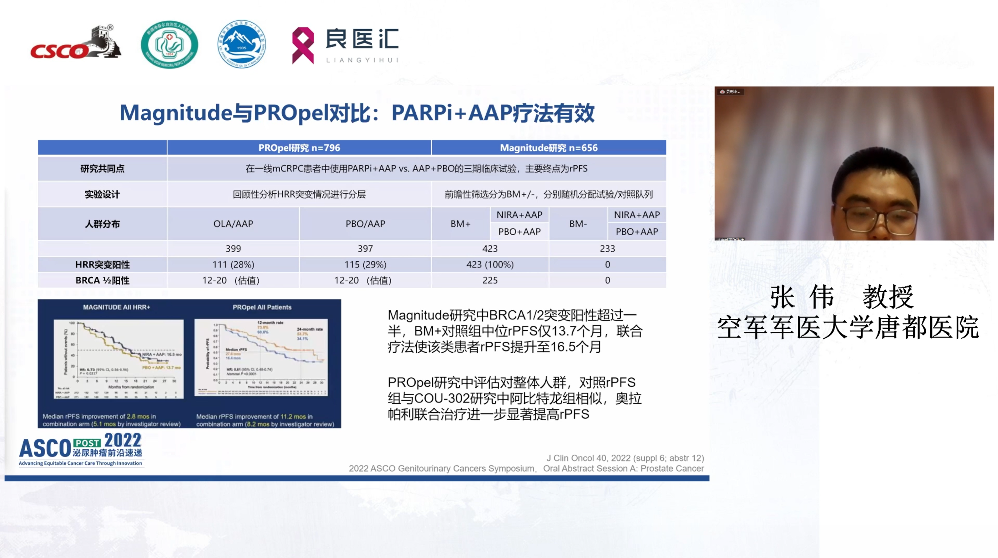 空军军医大学唐都医院张伟教授聚焦转移性去势抵抗性前列腺癌(mCRPC),分享了2022 ASCO前沿研究进展,探讨PARP抑制剂在mCRPC阶段的探索和应用前景。西安交通大学第一附属医院姚煜教授重点探讨了EGFR阳性NSCLC患者面临的困境以及近年来多种联合治疗模式、EGFR-TKI加量治疗等取得的突破。新疆维吾尔自治区人民医院陈茹教授分析了转移性激素敏感性前列腺癌(mHSPC)治疗策略,探讨了新型联合雄激素阻断(CAB)的优势。