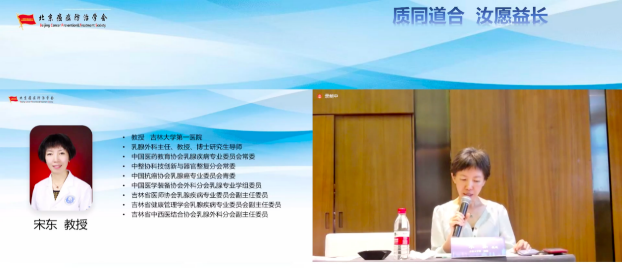 来自吉林大学第一医院乳腺外科宋东教授和吉林大学第二医院张研教授致开场辞,宋东教授指出,本次会议的启动仪式很震撼,让人印象深刻,会议内容丰富多彩,整个会议从临床实际需求出发,探讨热门话题乳腺癌保乳手术治疗进展,并且针对早期乳腺癌内分泌治疗的十大问题展开充分讨论。与此同时,宋东教授还指出针对内分泌治疗无论是AI治疗还是CDK4/6抑制剂治疗,在获得临床疗效的同时也要关注治疗产生的不良反应事件。