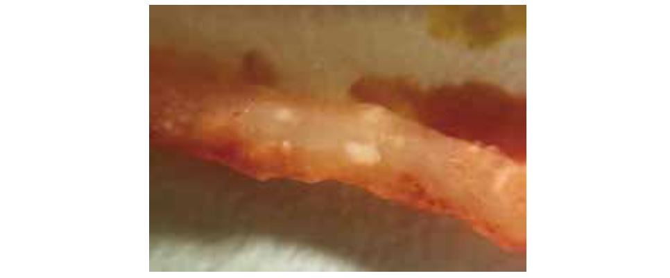 乳腺组织中有<1 mm的白色-浅黄色斑点(非浸润性导管癌)。