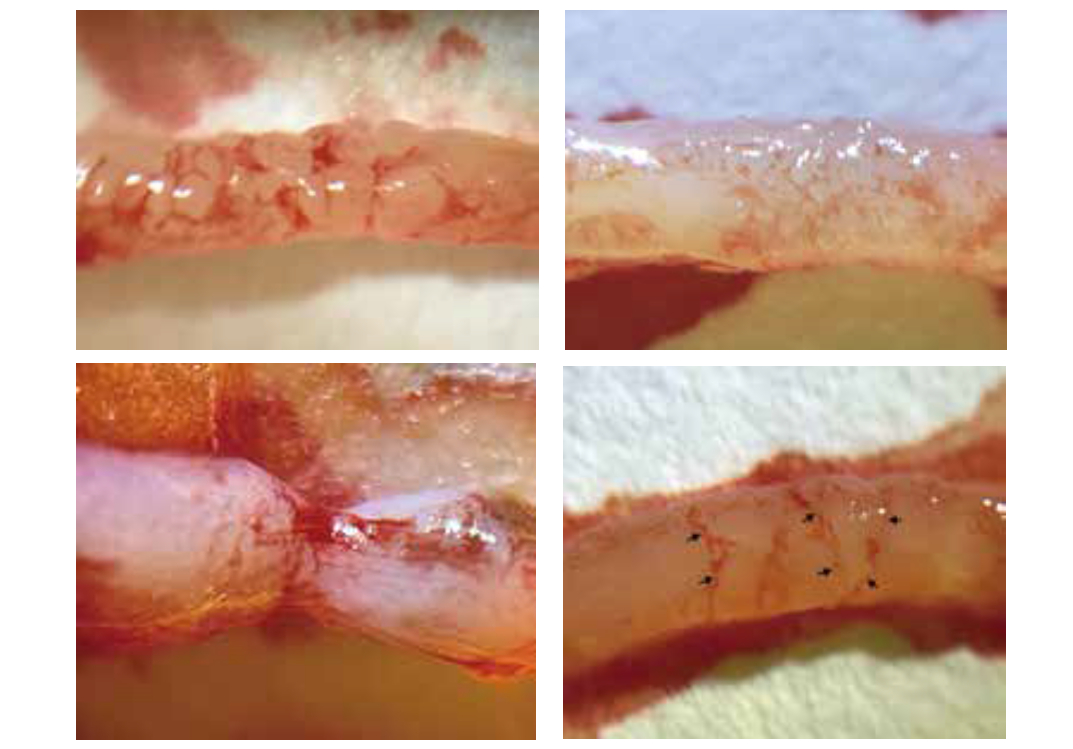 图5 a. VABB样本外观有乳头状结构。可见1-2 mm的较大圆形结构,整体呈乳头状(导管增生);b. VABB样本外观表现为圆形颗粒结构。观察到小于0.5-1 mm的圆形颗粒结构,比乳头状结构小,总体上没有乳头状形状(非浸润性导管癌);c. VABB样本外观收缩。可见伴有狭窄和变形,偶尔可见放射状白色和红色纤维结构(浸润性导管癌);d. VABB样本外观表现为红索样结构和水肿。粘液样或胶状结节由红色的线状结构分隔(箭头),此外存在透明水肿(纤维腺瘤)。