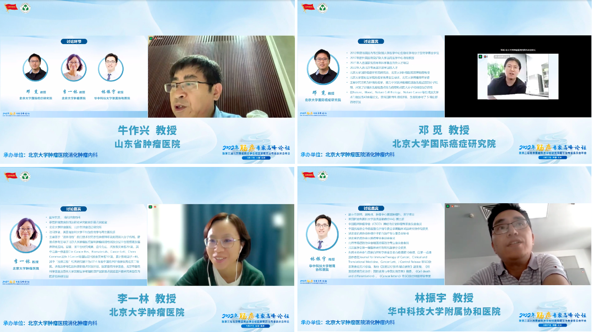 第四个讨论环节由山东省肿瘤医院牛作兴教授主持,北京大学国际癌症研究院邓觅教授、北京大学肿瘤医院李一林教授和华中科技大学附属协和医院林振宇教授担任讨论嘉宾,围绕申占龙教授的分享展开精彩讨论。