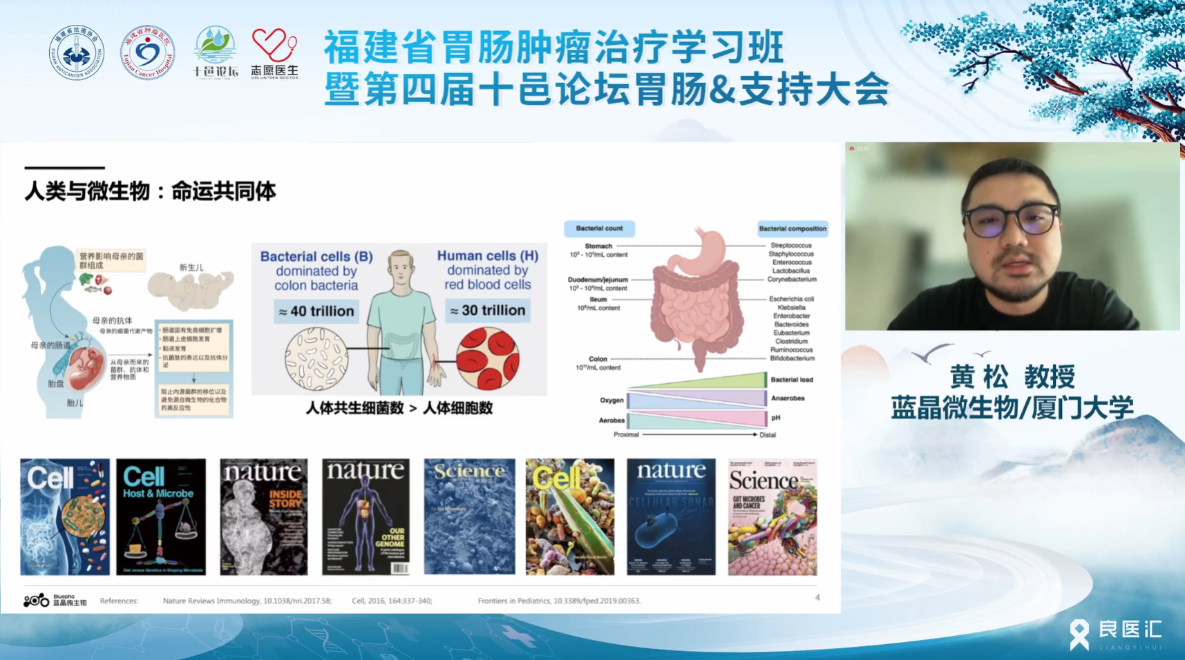 在厦门大学附属翔安医院徐立教授的主持下,来自蓝晶微生物/厦门大学的黄松教授分享了题为“微生物递送系统与胃肠道癌症治疗”的学术报告。人类与微生物是命运共同体,与人体共生的菌群也在影响着癌症的形成与治疗,临床研究提示肠道菌群影响着结直肠癌(CRC)的发展,而从免疫治疗响应者肠道寻找关联微生物联合免疫检查点抑制剂提高疗效的方案推动了微生物+免疫治疗的发展,目前该探索方向正处于挖掘关键因果的论证阶段。微生物递送系统可以更好地向肠道运送外来微生物,蓝晶微生物正在此发力期待推动微生物治疗在胃肠道治疗中的应用。随后,莆田市第一医院陈健教授及宁德市中医院苏林教授也对微生物治疗进行了讨论。